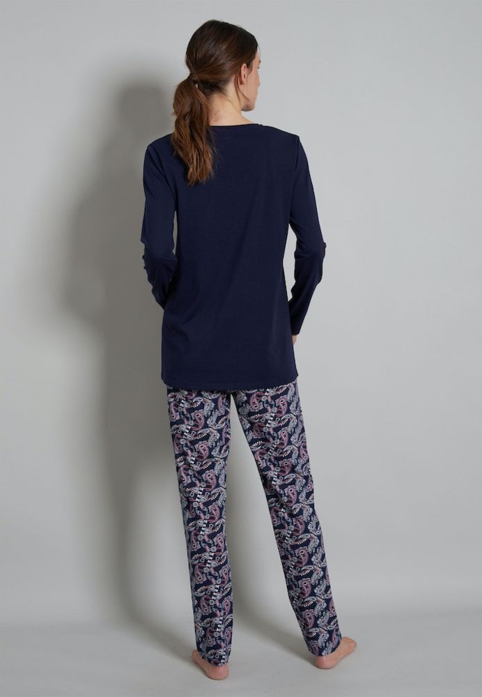Bei diesem hochwertigen Damen Pyjama wurde das Obterteil mit V-Ausschnitt sowie langem Arm in blau multi-color und die Hose mit blau und im paisley Dessin gemustert designt