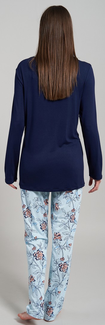 Bei diesem hochwertigen Damen Pyjama wurde das Obterteil mit romantischem runden Ausschnitt sowie mit langem Arm in marine-blau und die Hose in hell blau gemustert designt
