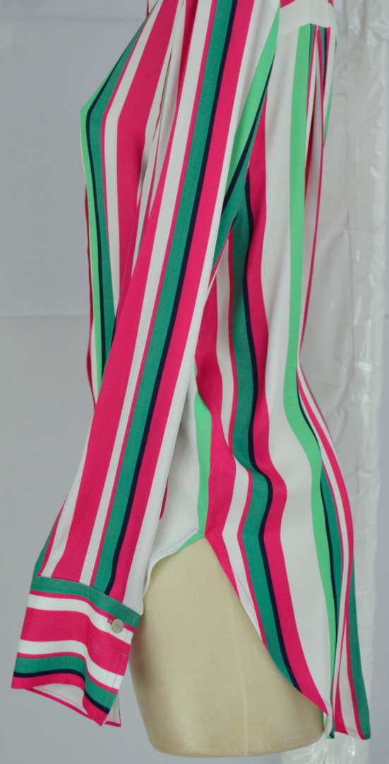 Diese sportive Streifenbluse mit 1/1 langem Arm und Manschetten wurde allover in pink-grün-weiß designt und ein echter Hingucker aus 100 % Viscose sowie seitlich geschlitzt