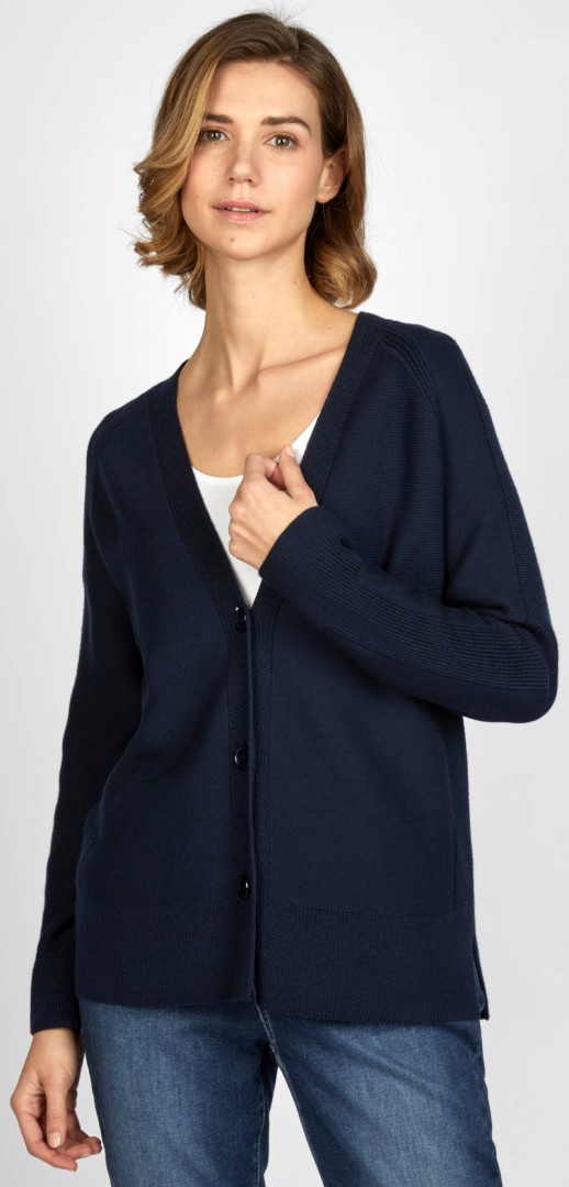 Diese hochwertige klassische Strickjacke in pazifik blau wurde als 3-Knopf Variante mit V-Ausschnitt designt und lässt sich immer prima kombinieren
