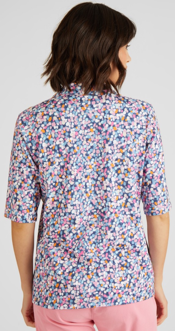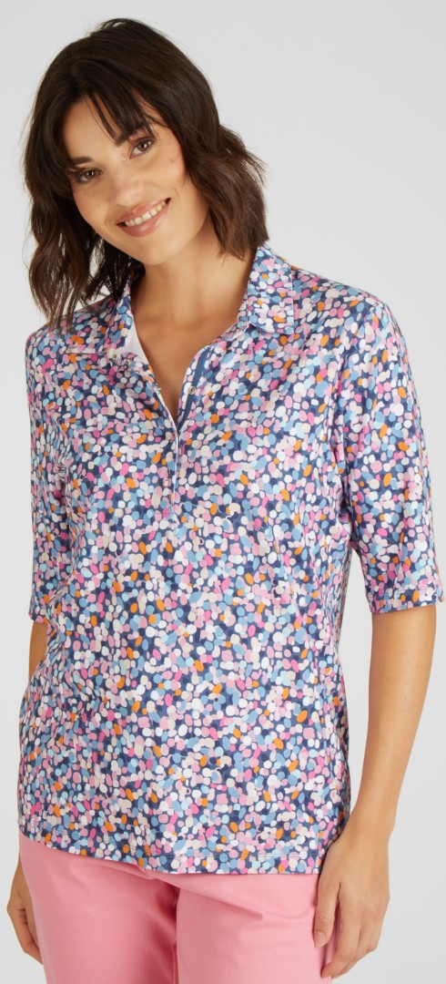 Das sportive Polo-Shirt mit 1/2 Arm wurde in allover mehrfarbig fein gemustert mit rose designt und kann überaus leicht kombiniert werden