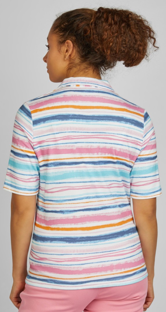 Das sportive Polo-Shirt mit 1/2 Arm wurde in allover mehrfarbig gemustert designt und kann überaus leicht kombiniert werden