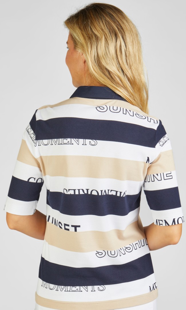 Das sportive 1/2 Arm Polo-Shirt wurde mehrfarbig geringelt mit ecrue als 5 -Knopf Krangen Variante designt und ist immer leicht kombinierbar