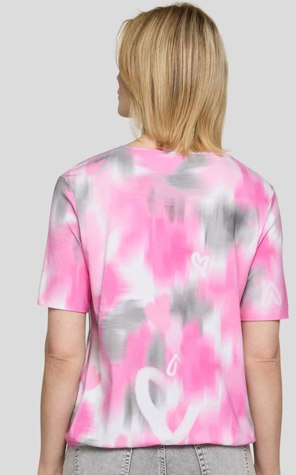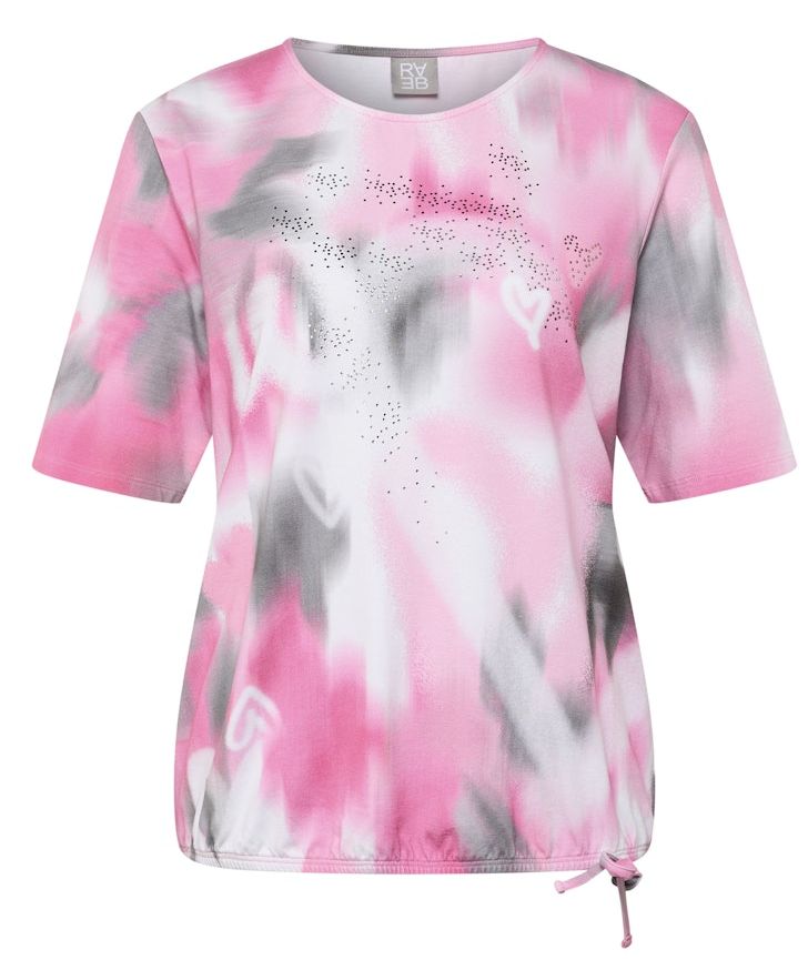 Das Shirt wurde in mehrfarbig mit Rose-Weiß-Grau sowie rundem Ausschnitt und 1/2 Arm designt. Der edle Besatz mit Strass sowie der Rund-Um-Gummi Abschluss zum raffen verleiht diesem Shirt etwas besonderes