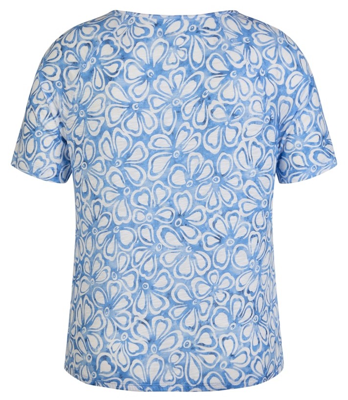 Ein sportives Blusenshirt mit 1/2 Arm in weiß-bleu gemustert bei dem der runde Ausschnitt mit Bändchen designt wurde