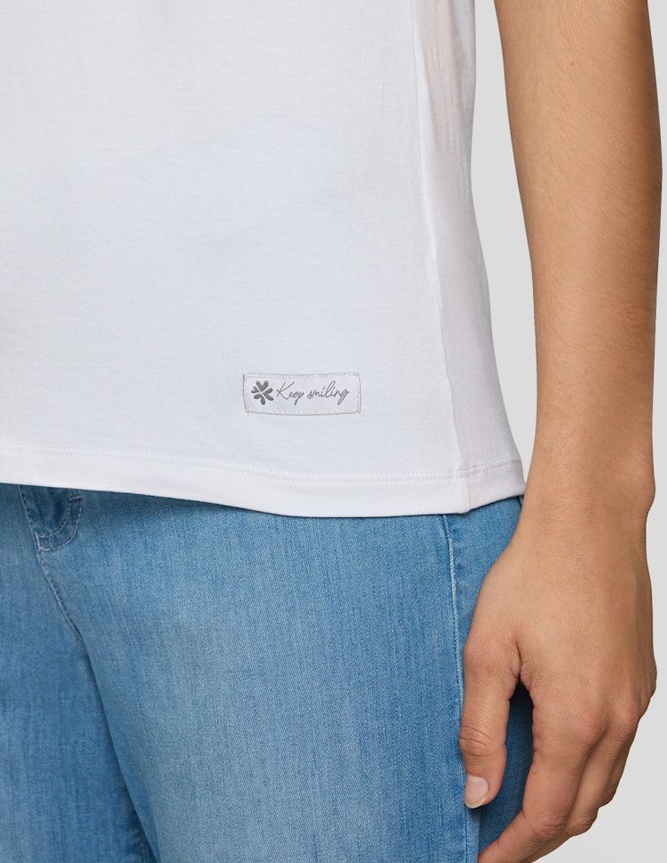 Das sportive Shirt aus 95 % Baumwolle wurde in weiß designt versehen und ist natürlich ein Must-have und leicht kombinierbar mit 1/2 Arm und rundem Ausschnitt