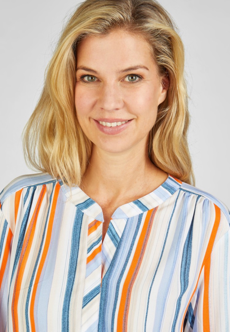 Leuchtend und schrill kommt diese Bluse in Längsstreifen und mit kleinem V-Ausschnitt zu Ihnen nach Hause. Der Abschluss an den Ärmeln wurde enganliegend und gerafft designt