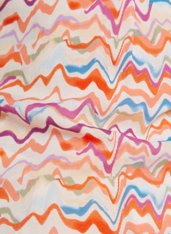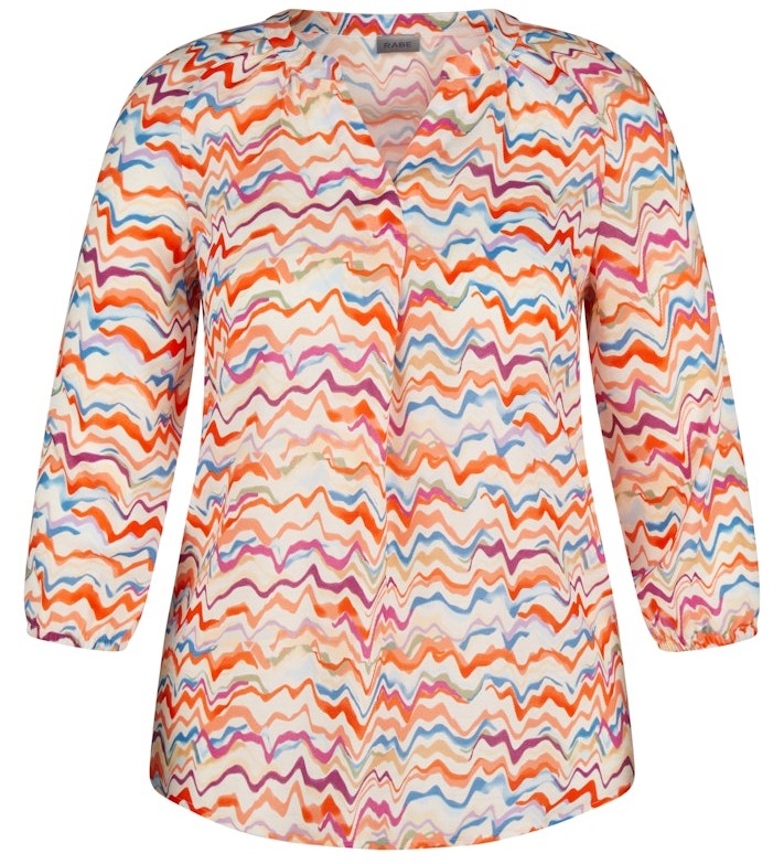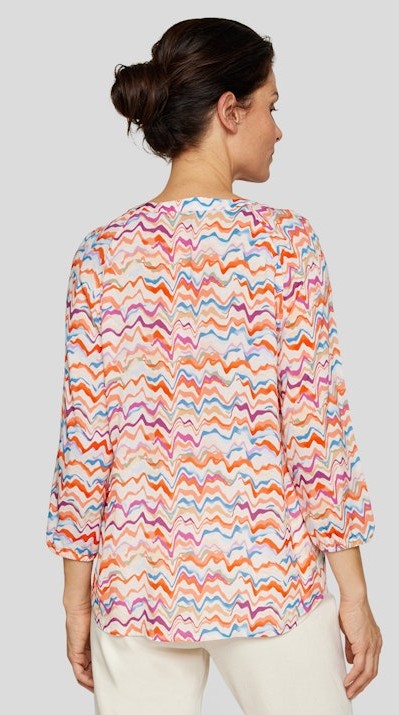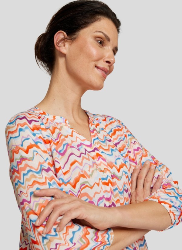 Dieses leicht fließende Shirt mit 3/4 Arm gehört zu den Highlights der Saison. In mehrfarbig mit mandarin gemustert sowie mit geschlitztem runden Ausschnitt íst das Shirt immer ein Hingucker und zudem leicht kombinierbar
