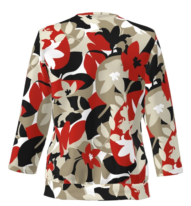 Dieses sportive Shirt mit 3/4 Arm wurde mit Blütendesignt in mehrfarbig gemustert mit cranberry designt. Die dezente Raffung unter dem runden Ausschnitt sowie das Bündchen im Abschluss verleiht diesem Shirt einen zusätzlichen Charme