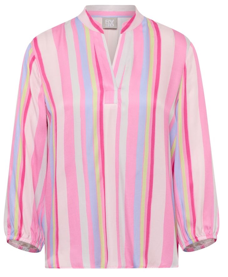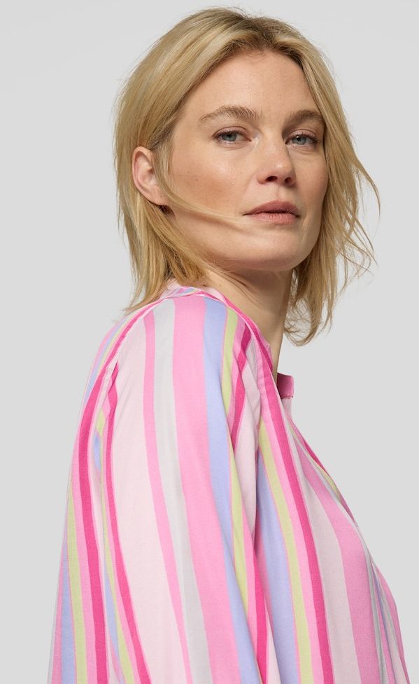 Leuchtend und schrill kommt diese Bluse in Längsstreifen und mit kleinem V-Ausschnitt zu Ihnen nach Hause. Der Abschluss an den Ärmeln wurde enganliegend und gerafft designt