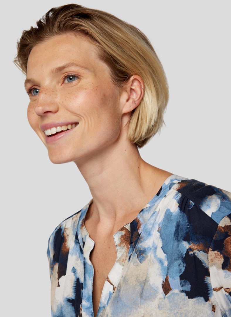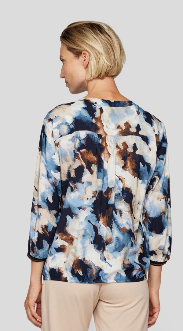 Das sportive Blusen-Shirt mit 3/4 langem Arm wurde in mehrfarbig gemustert sowie Rund-Um-Gummi im Abschluss designt und lässt sich immer leicht kombinieren