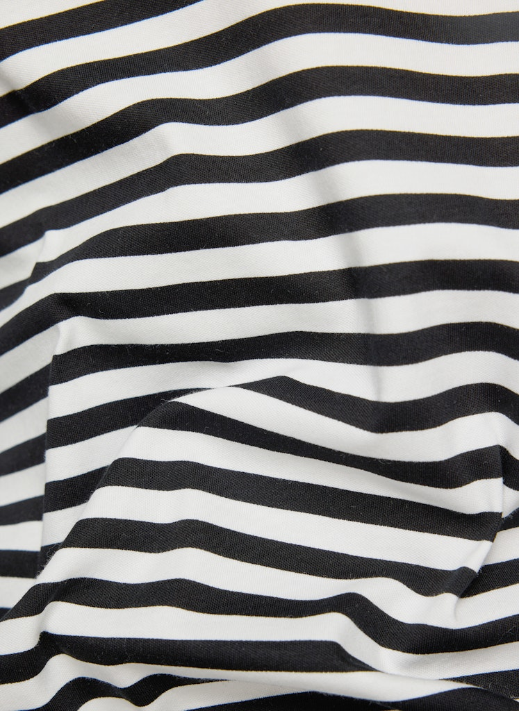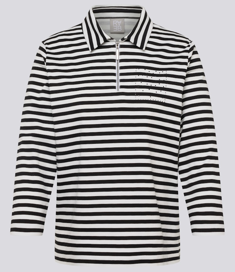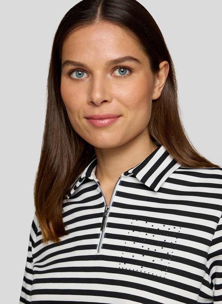 Dieses sportive Polo-Shirt mit R-V wurde in allover geringelt mit schwarz designt und kann überaus vielseitig kombiniert werden