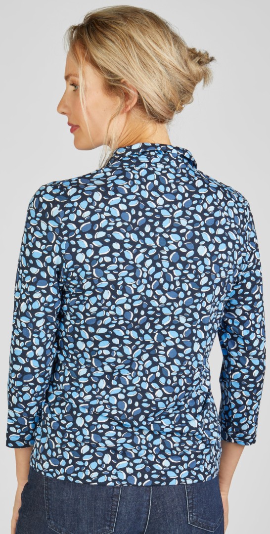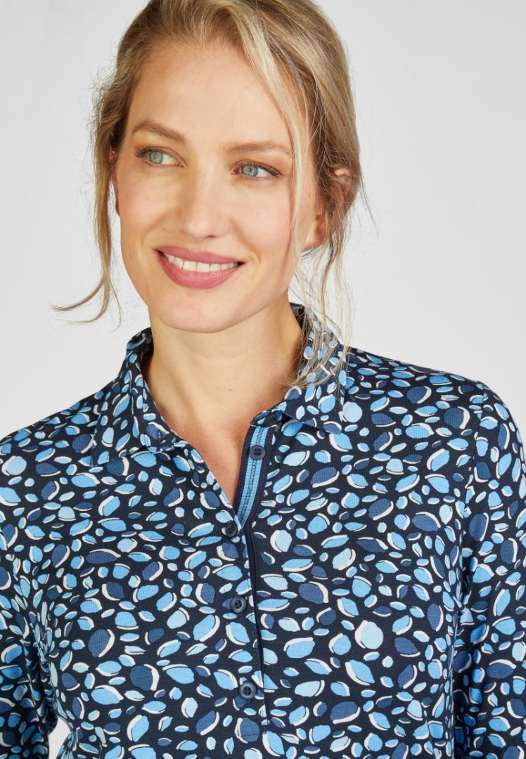 Das sportive Polo Shirt als 5 -Knopf Variante mit 3/4  Arm besticht durch seine Farbstellung in mehrfarbig fein gemustert mit bleu. Formbeständig, pflegeleicht und waschbar sowie mit leichten Stretch Anteil ist das Shirt zudem das ganze Jahr tragbar