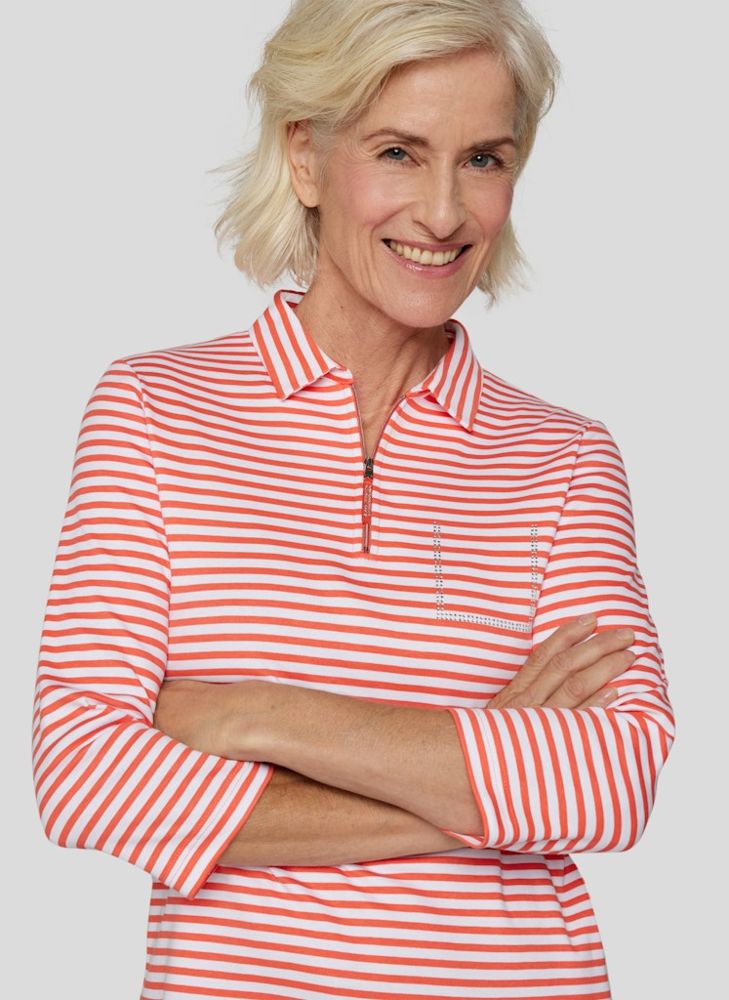 Dieses sportive Polo-Shirt mit R-V -Kragen wurde allover geringelt mit Mandarine designt und kann überaus vielseitig kombiniert werden