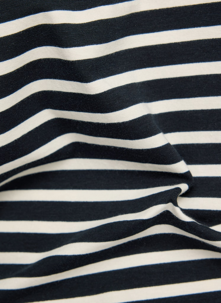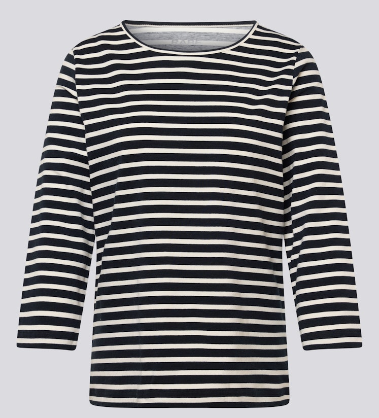 Das sportive T-Shirt wurde mit rundem Ausschnitt und 3/4 Arm sowie mit schwarz geringelt designt und lässt sich immer und das ganze Jahr hindurch leicht kombinieren