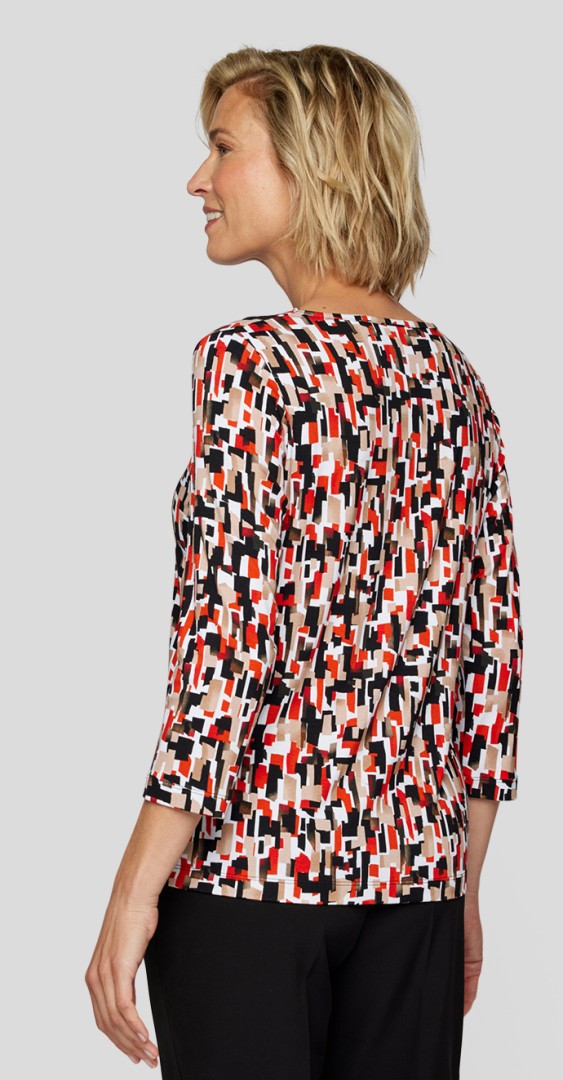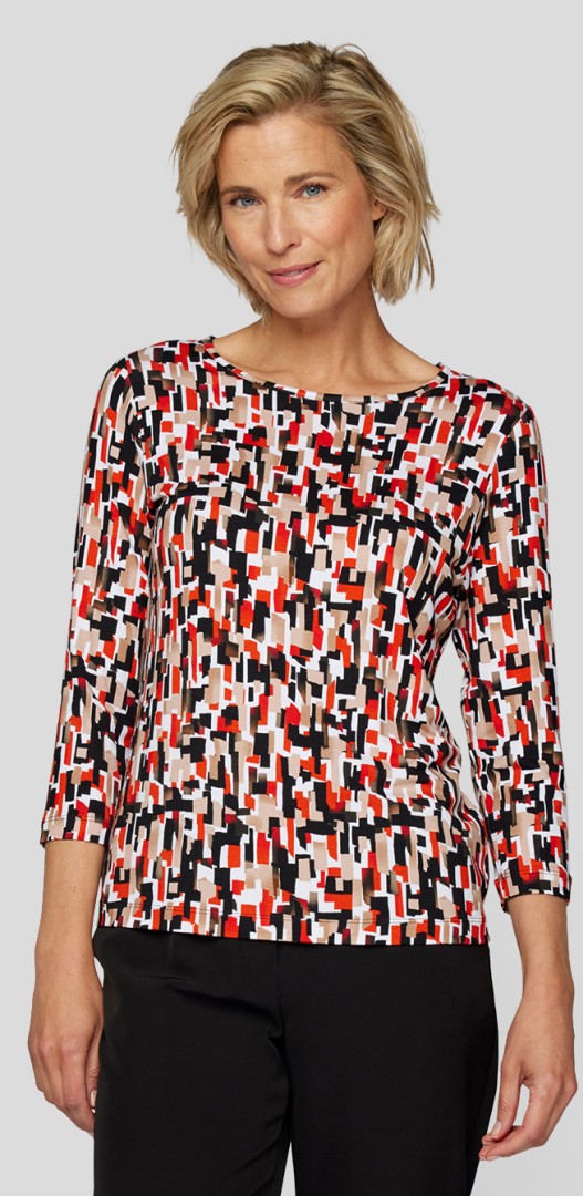 Das angehnem zu tragende Shirt wurde mit rundem Ausschnitt und 3/4 Arm designt. Der grafische Allover-Print in Schwarz-Beige-Rot bringt frischen Schwung in Ihre Herbstgarderobe