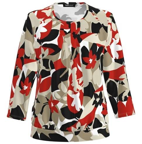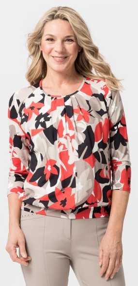 Dieses sportive Shirt mit 3/4 Arm wurde mit Blütendesignt in mehrfarbig gemustert mit cranberry designt. Die dezente Raffung unter dem runden Ausschnitt sowie das Bündchen im Abschluss verleiht diesem Shirt einen zusätzlichen Charme