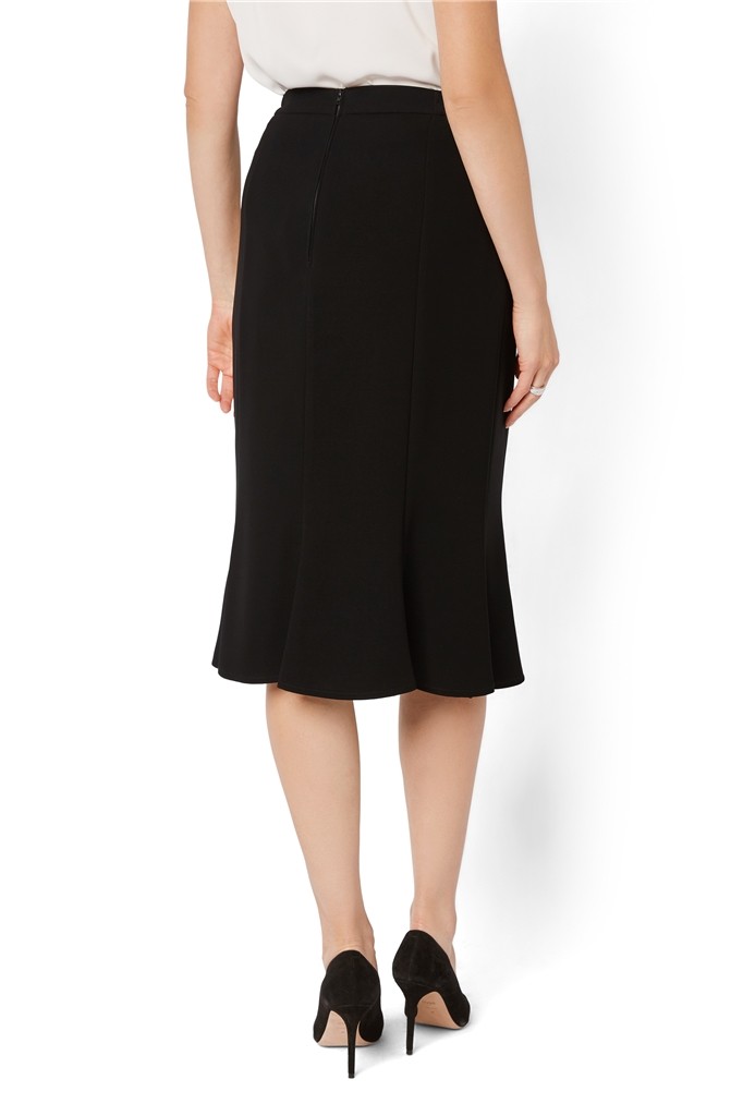Dieser gefütterte schwarze Godetrock macht durch den seitlichen Gummizug immer ein gute Figur und ist natürlich knitterfrei. Durch die leicht schwingenden 8 Bahnen ist dieser etwas längere Rock ein echter Klassiker und überaus vielseitig kombinierbar