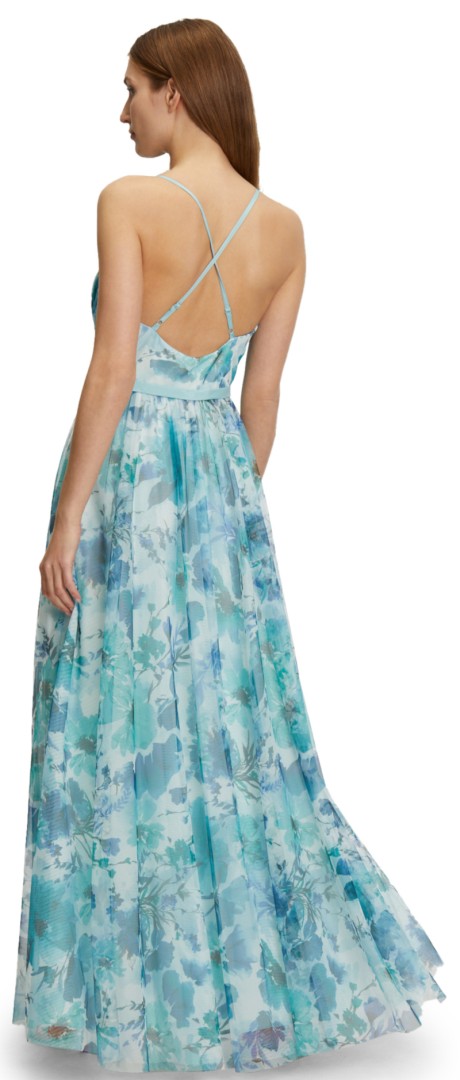 Dieses maxi lange Kleid ohne Arm wurde in white/mint designt. Mit V-Ausschnitt sowie gepolsterten Cups und floralem Dessin wurde dieses Modell mit transparentem Tüll versehen. Auch der in Falten gelegte Rockteil verleit diesem Kleid einen ganz besonderen Charme