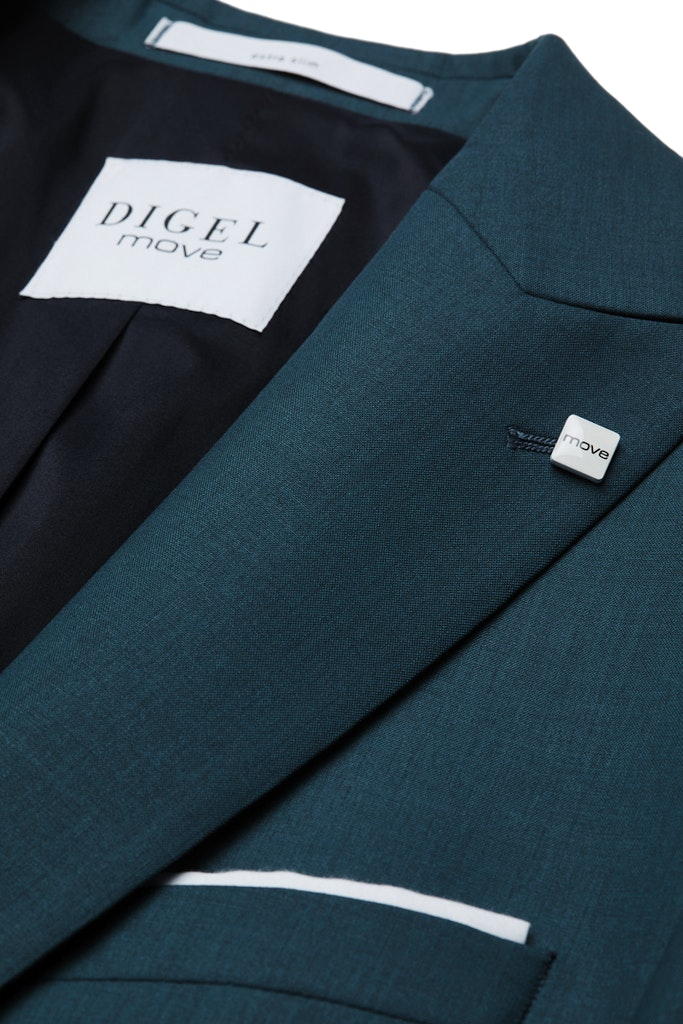 Höchste Qualität und Verarbeitung sowie viele interessante Details machen diesen DIGEL move Anzug Blazer zu etwas besonderem. In edlem Petrol-Blau und aus feinster italienischer Schurwolle in extra slim fit gefertigt wird dieser Blazer nicht nur im Business sondern auch zu ganz besonderen Anlässen getragen