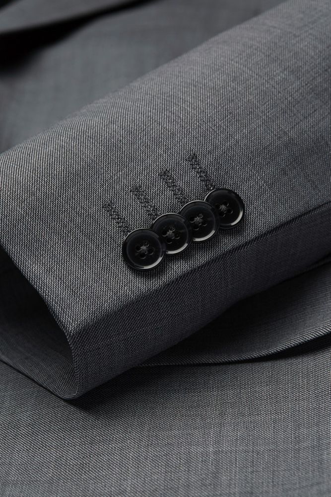 - Gerade geschnittener Einreiher mit zwei Knöpfen, Revers des Sakkos mit Knopfloch links und Brusttasche
