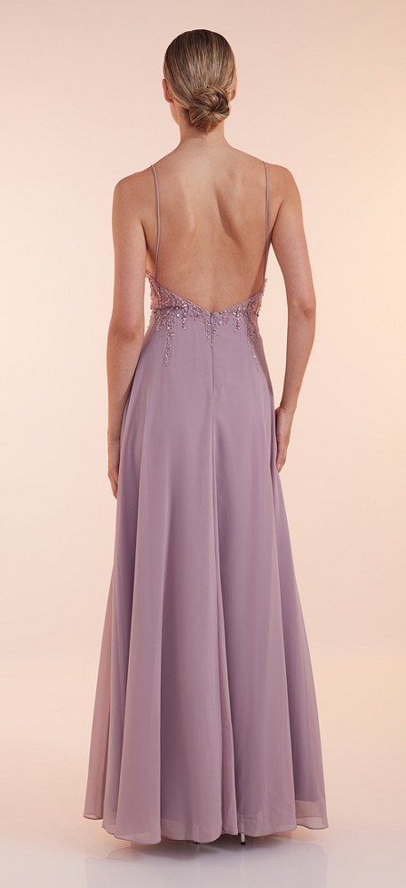 Bei diesem romantischem Ballkleid wurde das Oberteil mit V-Ausschnitt sowie gepolsterten Cups mit feinen Perlen und Spitze reich verziert sowie mit dezent transparentem Einsatz versehen. Auch der offene Rücken macht dieses Modell zum echten Hingucker