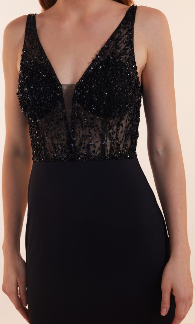 Bei diesem romantischem Ballkleid wurde das Oberteil mit V-Ausschnitt sowie gepolsterten Cups im Blouson Style designt und mit feinen glänzenden Pailletten versehen. Auch der leicht ausgestellte und vorne etwas kürzer als hinten gefertigte Chiffon Rockteil macht das Kleid in black zum Allrounder für alle besonderen Anlässe