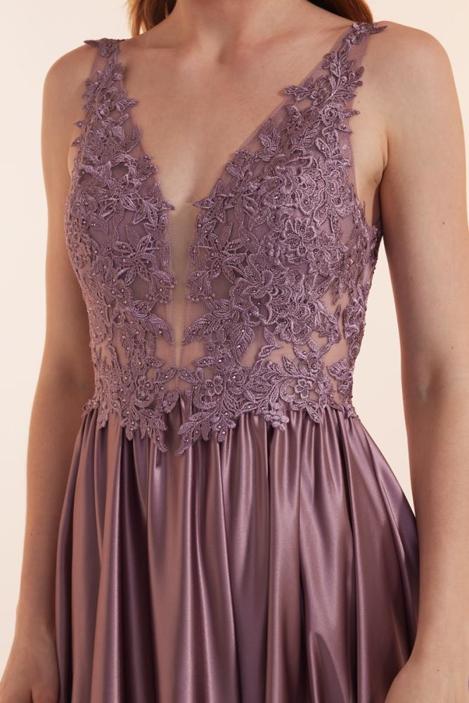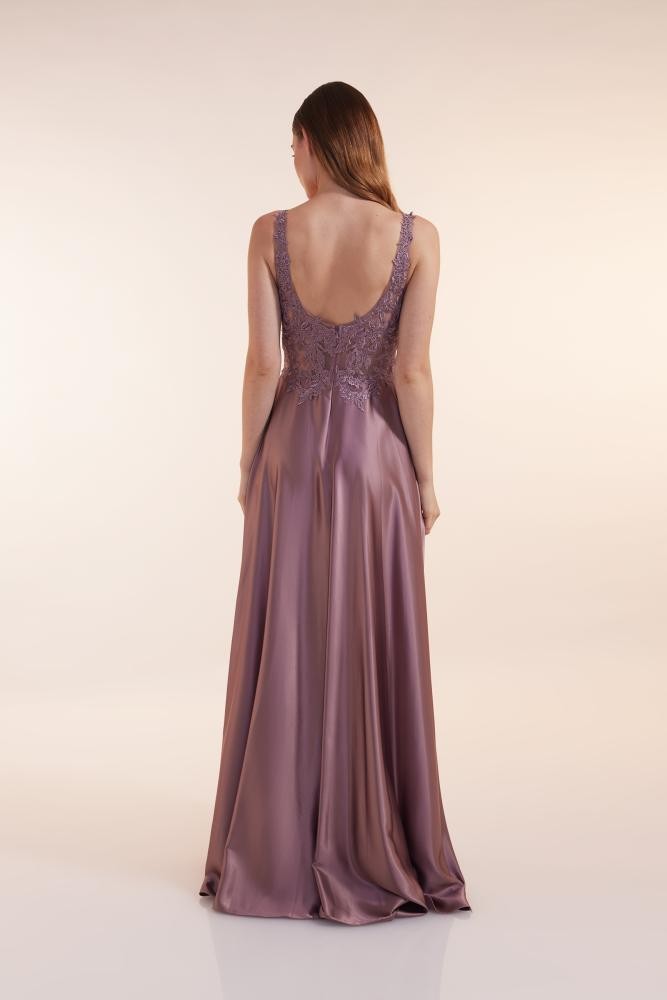 Bei diesem romantischem Ballkleid wurde das Oberteil mit V-Ausschnitt sowie gepolsterten Cups mit feinen Perlen und Spitze reich verziert. Der Rockteil aus edlem Satin wurde hier bis zur Taille geschlitzt und in romantische Falten gelegt