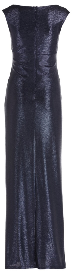 Dieses feminine ärmellose maxi lange Abendkleid mit dem 60 cm langem Schlitz vorne wurde in night sky melange aus edelem Jersey mit Glanz sowie Wasserfallausschnitt ohne Arm designt und gehört auch durch die romantische Raffung mit Brosche zu den Hightlights der Saison