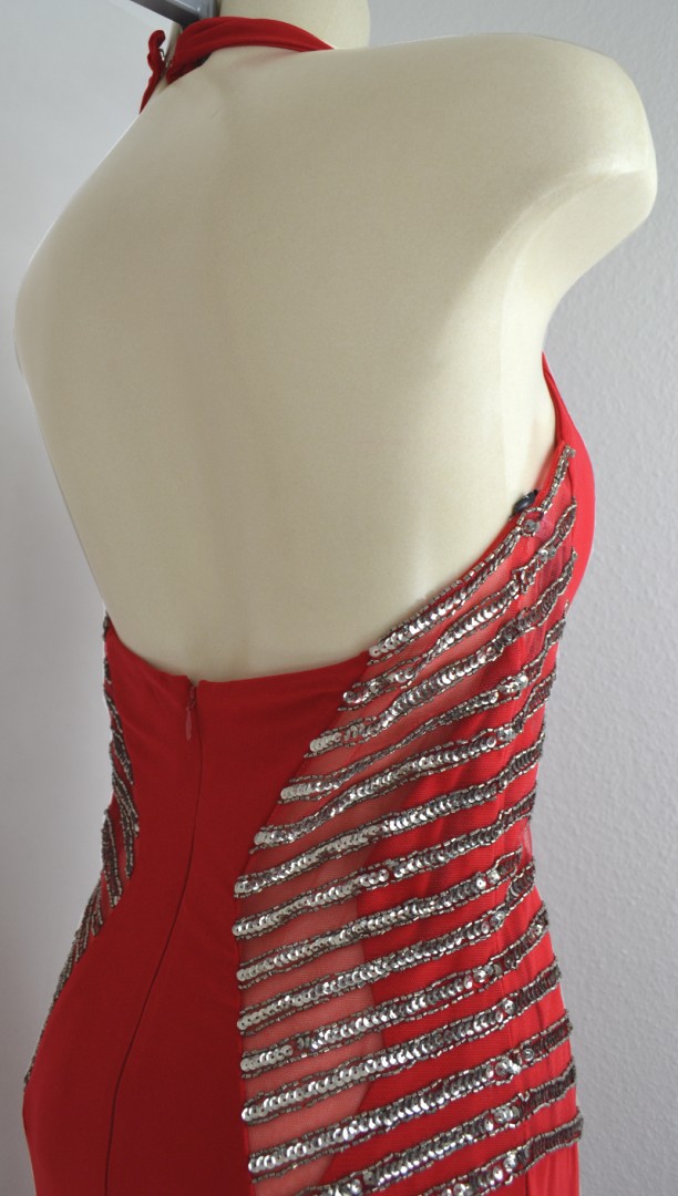 Dieses elegant und etwas enger anliegende Ballkleid aus feinem Chiffon wurde seitlich sowie am Bustier leicht transparent mit Pailletten besetzt designt. Das Modell ist hinten etwas länger gearbeitet. In der Farbe red mit passender Stola ist Modell ein echter Hingucker für einen ganz besonderen Auftritt