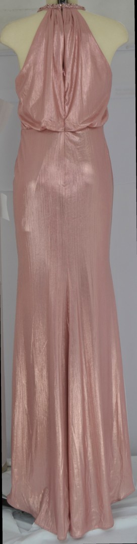 Dieses traumhafte Ballkleid im Blouson Styl wurde in rose mit Glanz designt. Der Ausschnitt mit Neckholder wurde hier mit opulenten Perlen versehen. Auch der Rockteil mit kleiner Schleppe verleiht diesem Modell einen besonderen festlichen Charme