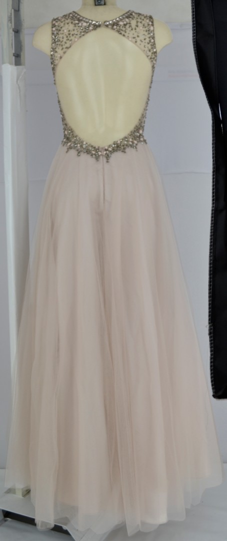 Bei diesem langen Ballkleid in safari beige wurde das Oberteil mit rundem Ausschnitt mit viel Strass und Schmuck designt. Auch der in Falten gelegte und leicht ausgestellte Rockteil aus Mesch sowie die offene Rücken Partie macht dieses Modell mit passenem Schal in Mesch zum echten Hingucker