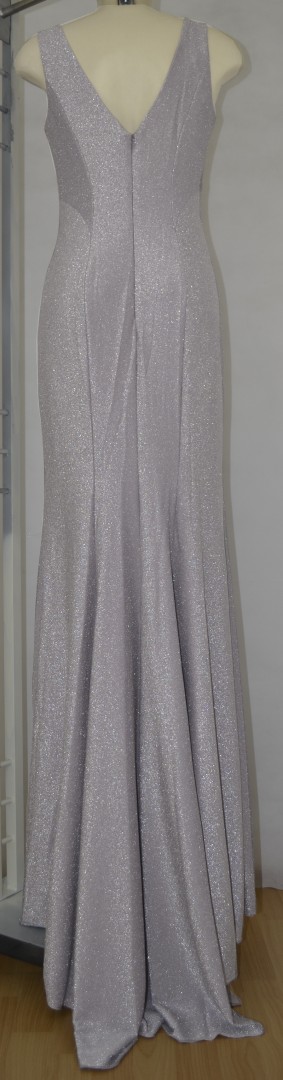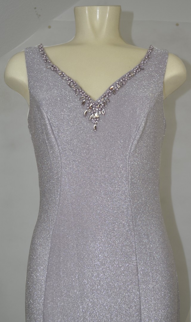 Dieses leicht glänzende Ballkleid wurde in silver lilac designt. Mit dem Strass besetztem V-Ausschnitt sowie in A-Form ist dieses Modell ein echter Hingucker unter den neuen festlichen unique Kleidern mit ca. 40 cm langer Schleppe