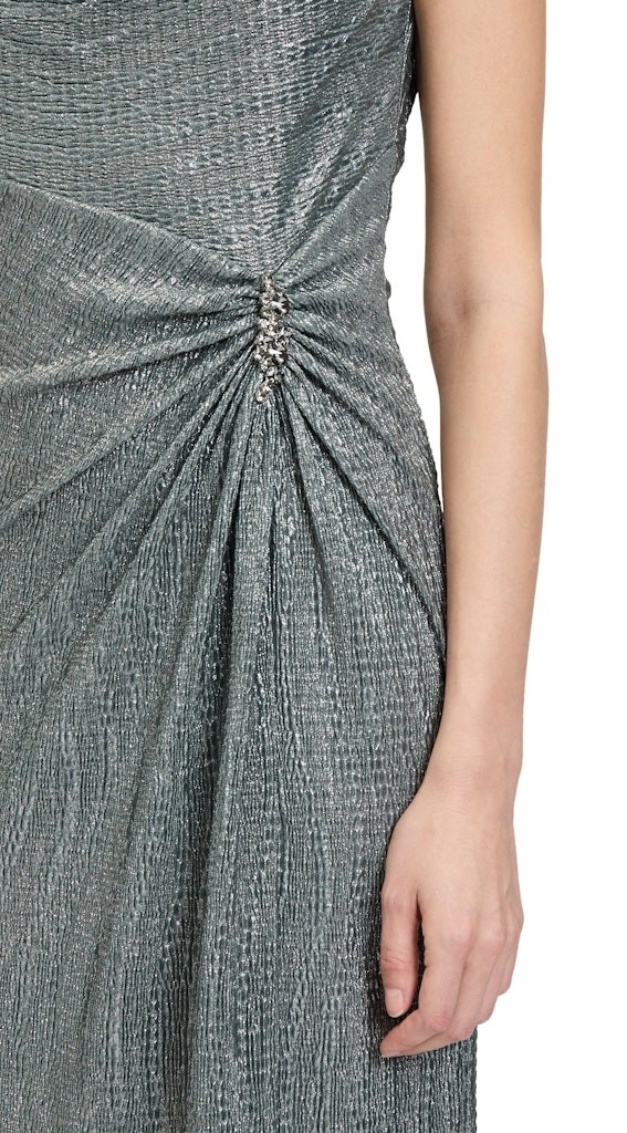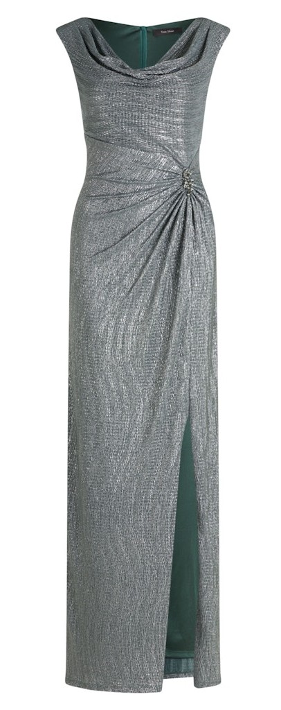 Dieses feminine ärmellose lange Edeljersey Abendkleid mit viel Glanz wurde mit Wasserfall Ausschnitt sowie seitlicher Raffung in dark green-grey designt und mit auch duch den langen Schlitz ein echter Hingucker für Ihren besonderen Anlass