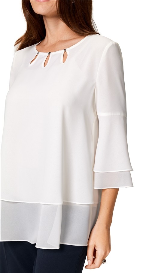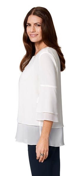 Dieses Blusenshirt wurde mit 3/4 langem Arm in marshmallow designt und kann auch zu den ganz besonderen Anlässen getragen werden. Die Lagen-Optik mit dem leicht transparentem Abschluss sowie der romantische Ausschnitt verleihen diessem Shirt einen besonderen Charme