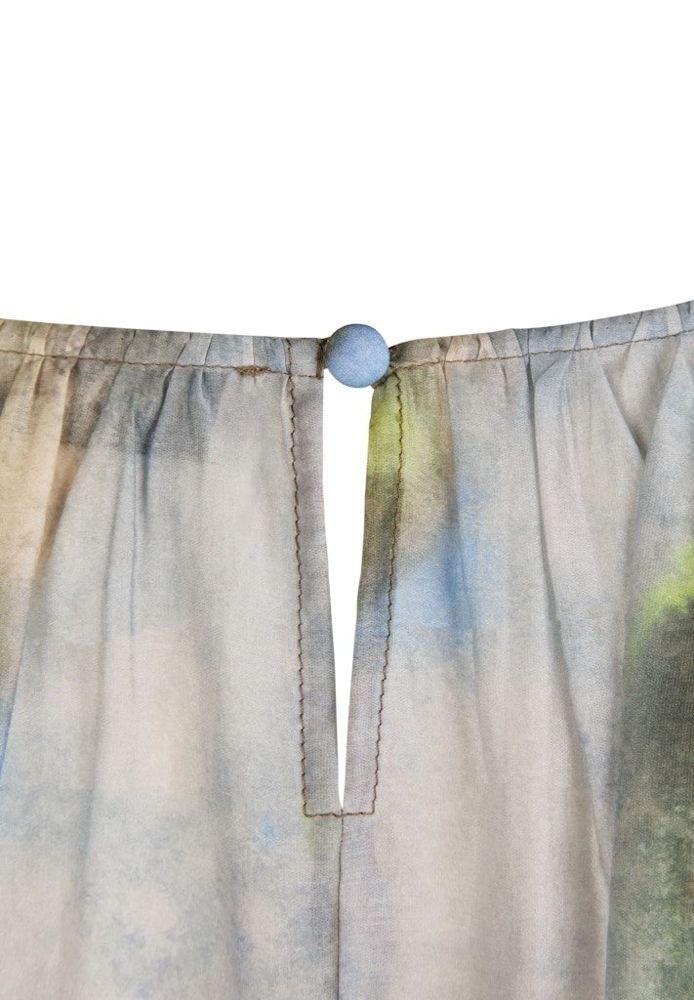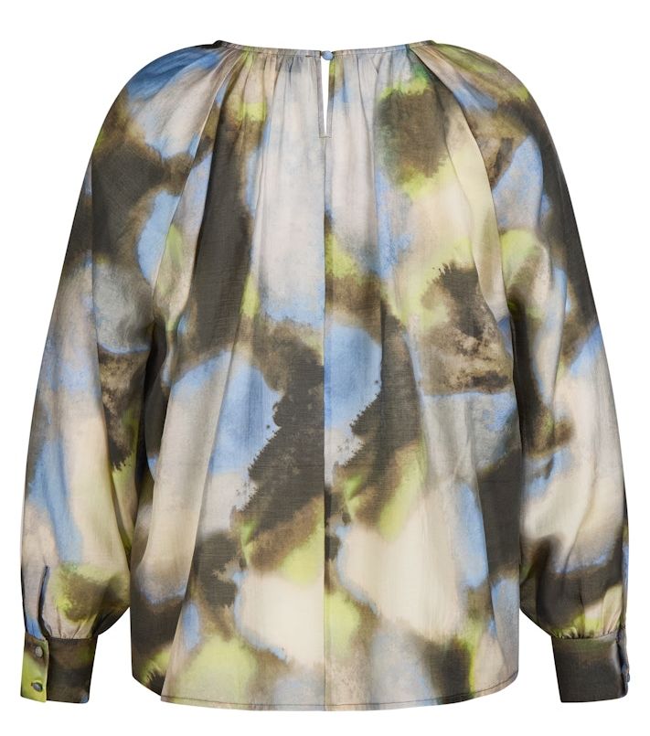 Diese Bluse wurde in mehrfarbig mit Agave gemustert. Die romantische Raffung unter dem runden Ausschnitt und die Ärmel mit elastischem breiten Abschluss machen dieses Shirt zum echten Hingucker in mehrfarbig gemustert