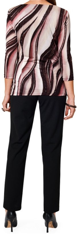 Das romantische Shirt können Sie auch zu den ganz besonderen Anlässen kombinieren. Die romantische Raffung sowie der runde Ausschnitt mit Spange macht dieses Modell mit 3/4 langem Arm in schwarz-rosenholz zum echten Hingucker