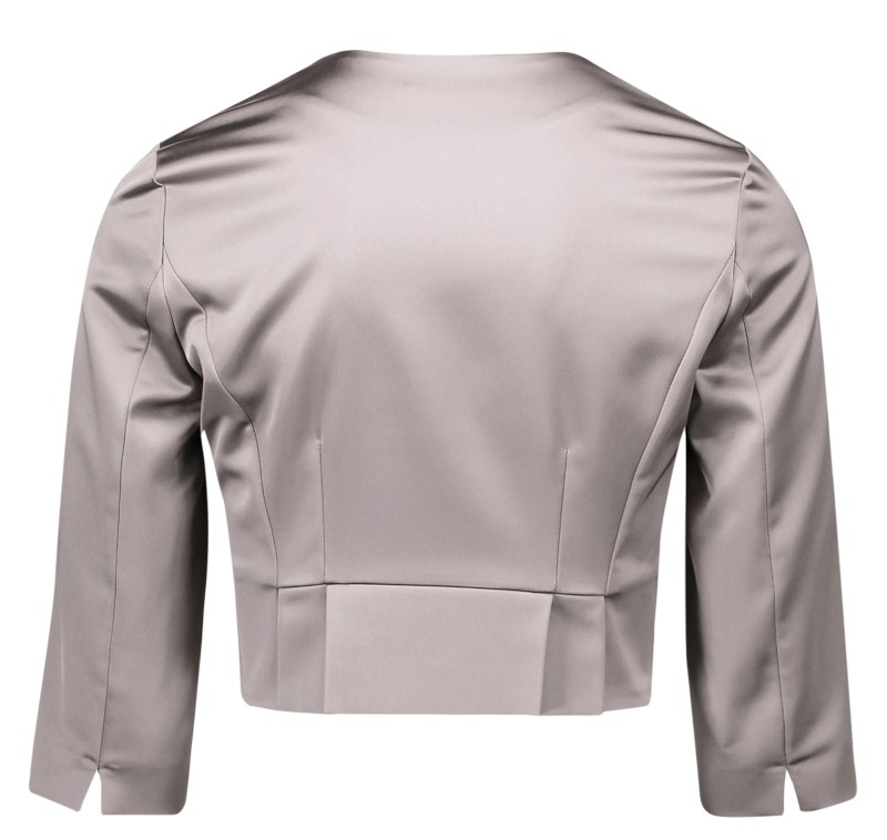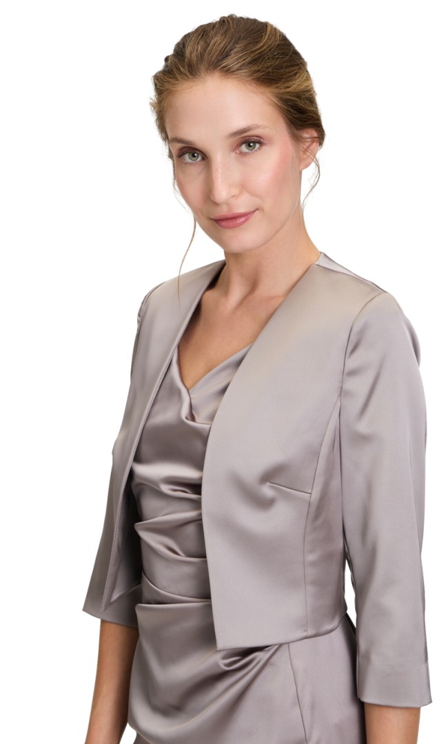 Eine edle Bolero-Jacke mit 3/4 Arm in smoky taupe die als ideale Ergänzung für Ihren besonderen Anlass getragen werden kann. Duch den Anteil von Elasthan machen Sie mit diesem leicht tailliertem Modell aus edlem Stretch-Satin immer eine gute Figur