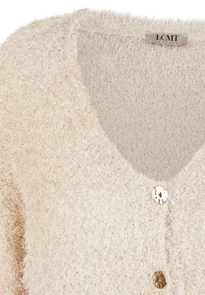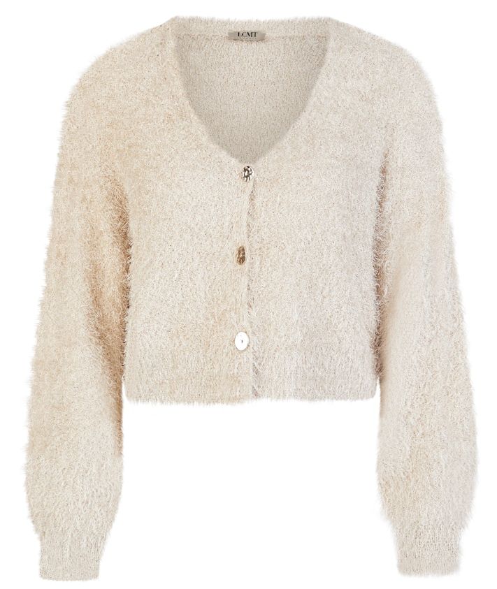 Diese kuschelige Boucle Strickjacke in Keramik (Beige) wurde als 3 -Knopf Variante mit etwas größerem V-Ausschnitt designt und ist immer leicht zu kombinieren