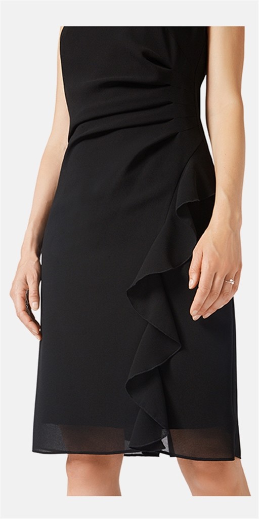 Ein Etuikleid das aus feinem Chiffon gefertigt wurde. Mit dem 23 cm Schlitz hinten sowie der romantischen Raffung in Taillenhöhe macht dieses Modell in uni schwarz immer eine sehr gute Figur und kann auch zu den besonderen Anlässen getragen werden