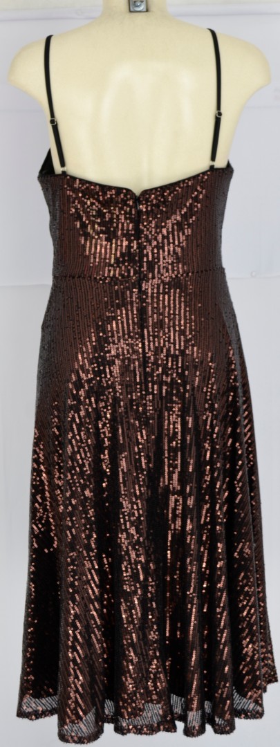 Das edle Kleid in black-brown wurde allover mit feinen Pailletten besetzt. In A-Form wurde der Rockteil in romantische Falten gelegt. Auch die eingefasste Herzcorsage verleiht diesem Modell mit passendem Mesh Tuch in schwarz einen ganz besonderen festlichen Charme