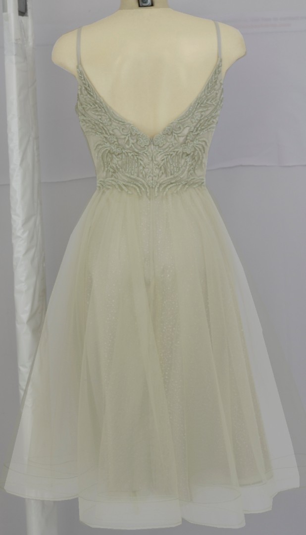 Dieses nicht ganz so kurze Cocktailkleid wurde in iced mint designt. Das Bustier mit Herzcorsage wurde hier mit dezent transparentem Einsatz viel Spitze sowie Schmuck versehen und vermittelt einen ganz besonderen Charme. Auch der in Falten gelegte und leicht schwingende ausgestellte Rockteil mit Mesh Überwurf passt perfekt zu diesem romantischen Modell