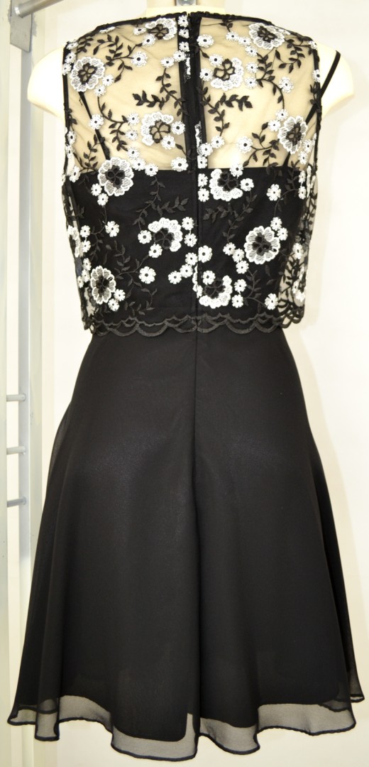 Dieses Kleid ist wie geschaffen für den besonderen Anlass. Das leicht transparente Oberteil mit feiner Spitze im Jacquard Dessin mit den weißen Blüten über dem uni schwarzem Kleid in A-Form vermittelt hier eine besondere romantische Eleganz