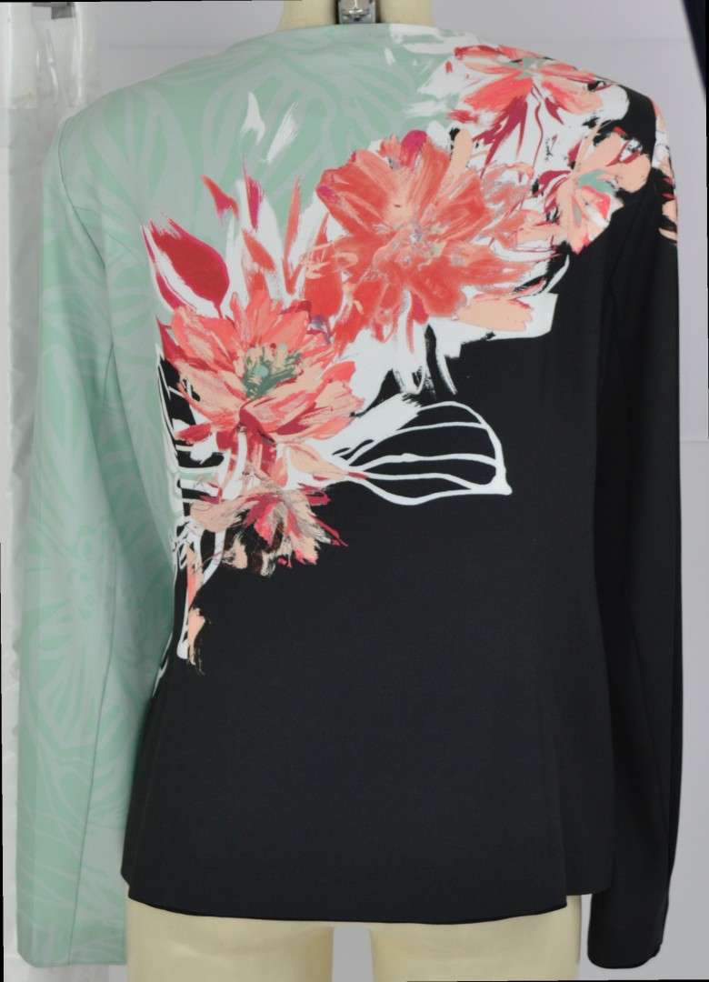 Die elegante Jacke mit rundem Ausschnitt und 1/1 Arm wurde in mehrfarbig mit lindgrün-koralle-schwarz designt und lässt sich auch zu den besonderen Anlässen prima kombinieren