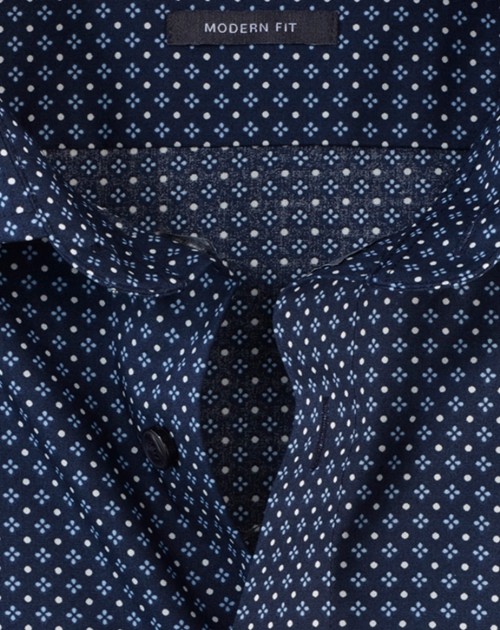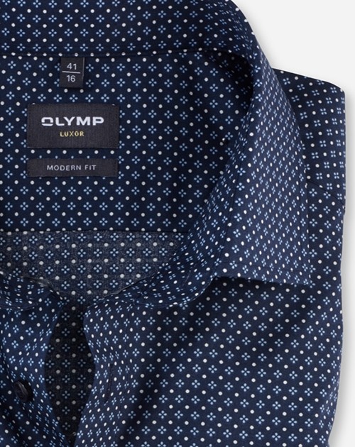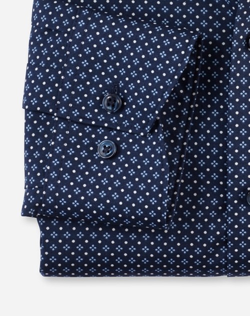 Ein smartes Minimal-Dessin in Bleu und Weiß auf Marine macht dieses Hemd zum Hingucker in modern fit also leicht tailliert geschnitten mit Global Kent Kragen sowie bügelfreier Variante