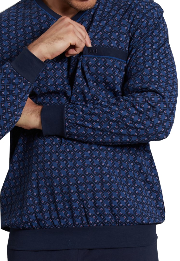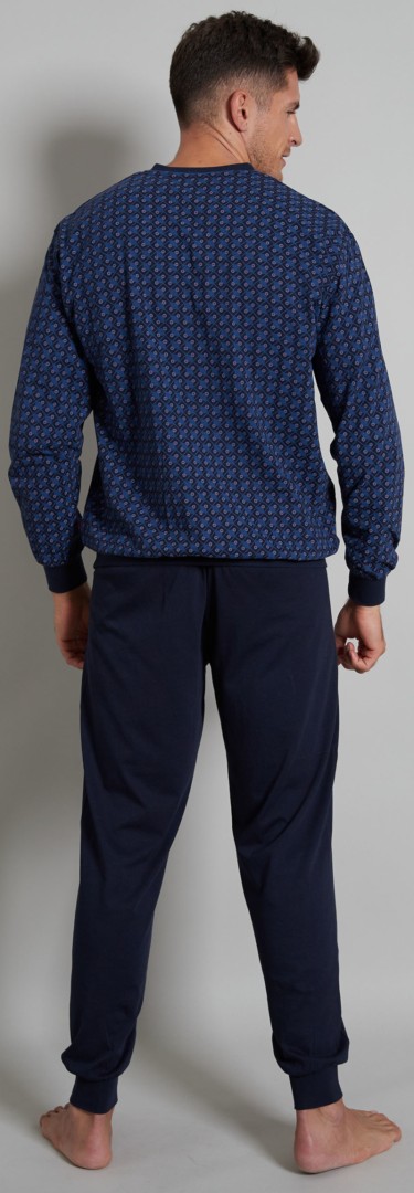 Bie diesem langen Pyjama mit V-Ausschnitt wurde das Oberteil fein gemustert sowie die Hose mit Bünchen im Abschluss in dunkel blau designt. Aus reiner bügelfreier sowie strapazierfähiger Baumwolle ist der Schlafanzug temperaturausgleichend, atmungsaktiv, hautsympathisch und erfüllt auch höchste Ansprüche an Qualität und Passform