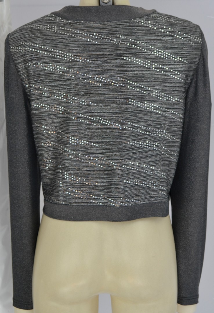 Diese edle Jacke wurde ohne Verschluss sowie langem Arm in schwarz-silber mit Glanz designt und lässt sich immer sehr leicht kombinieren
