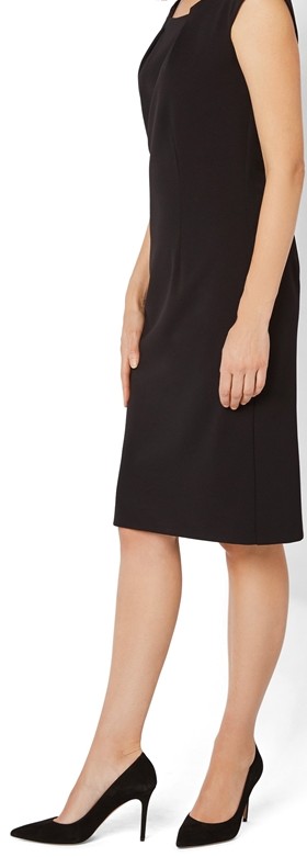 Das Etuikleid wurde in Jersey-Crepe Quatität designt und kann auch zu den besonderen Anlässen getragen werden. Mit der überschnittenen Schulter sowie den Abnähern und den eingelegten Falten am Ausschnitt machen Sie mit diesem Kleid in uni schwarz immer eine gute Figur