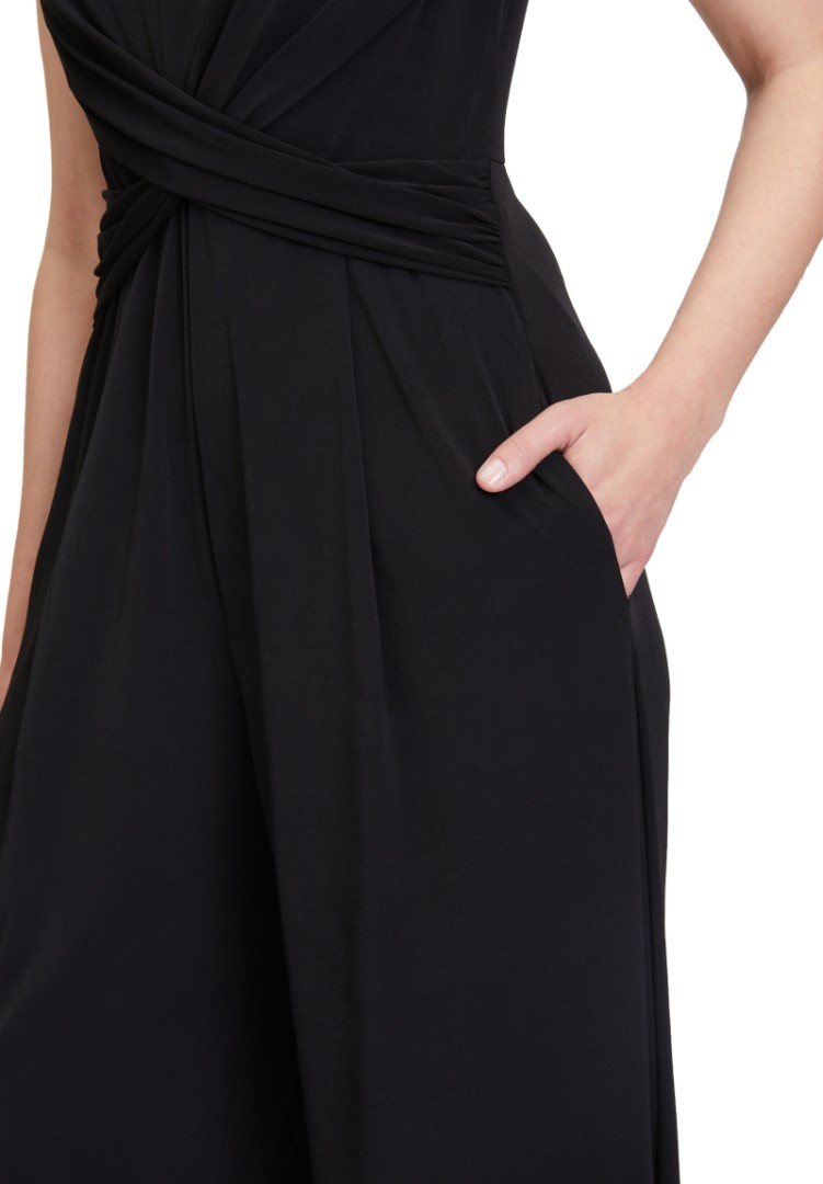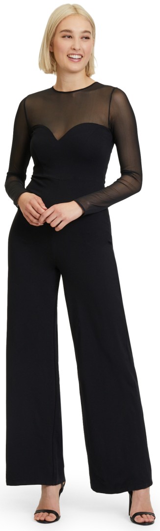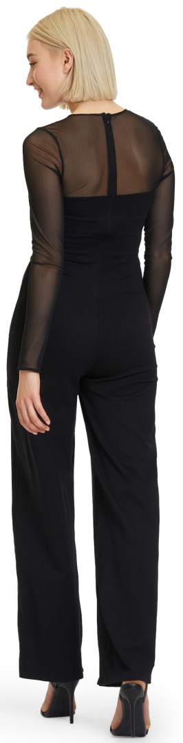 Dieser maxi lange Jersey Jumpsuit wurde in uni schwarz designt. Das Oberteil  wurde hier leicht transparent mit rundem Ausschnitt und 1/1 langem Arm aus edlem Chiffon gefertigt und macht diesen Overall zum echten Hingucker