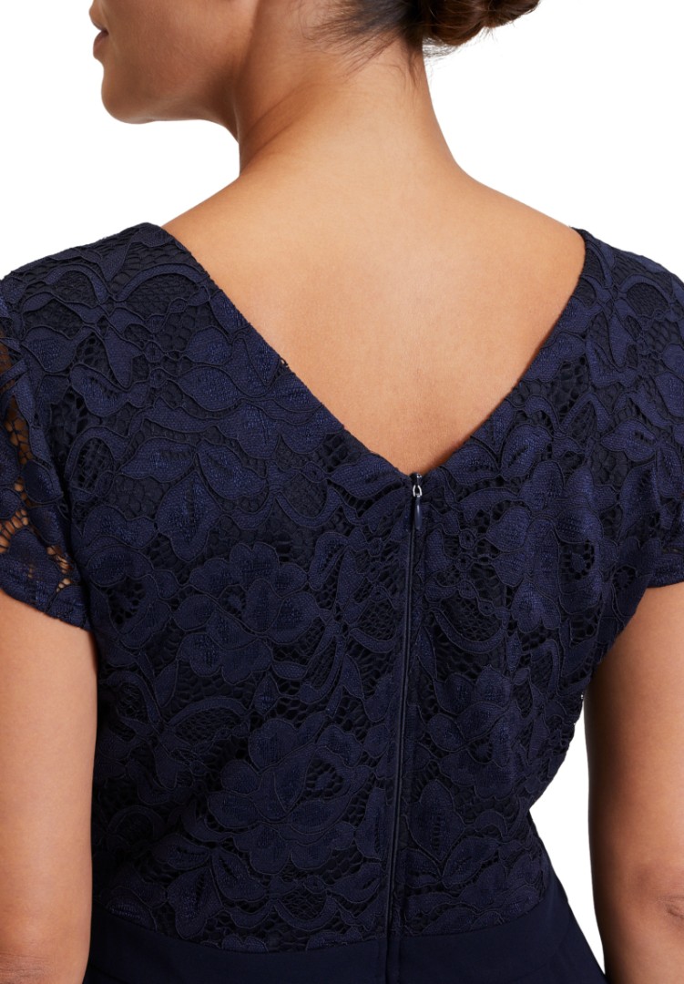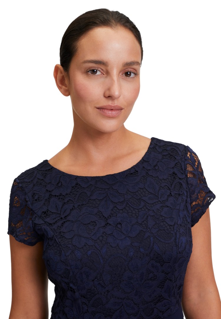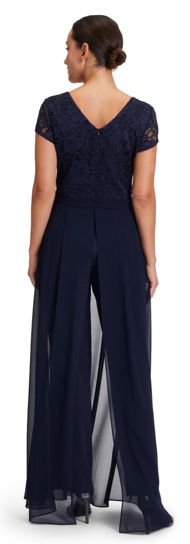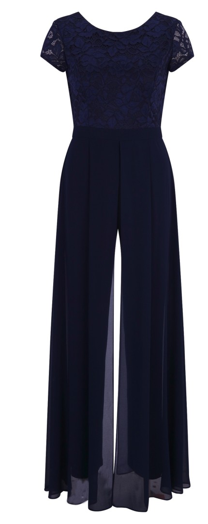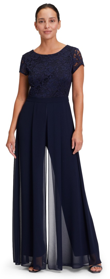 Bei diesem Overall mit rundem Ausschnitt wurde das Oberteil aus feiner floraler Spitze designt. Auch der dezent transparente 1/2 Arm macht diesen maxi langen Jumpsuit in night sky (dunkel blau) zum echten Allrounder